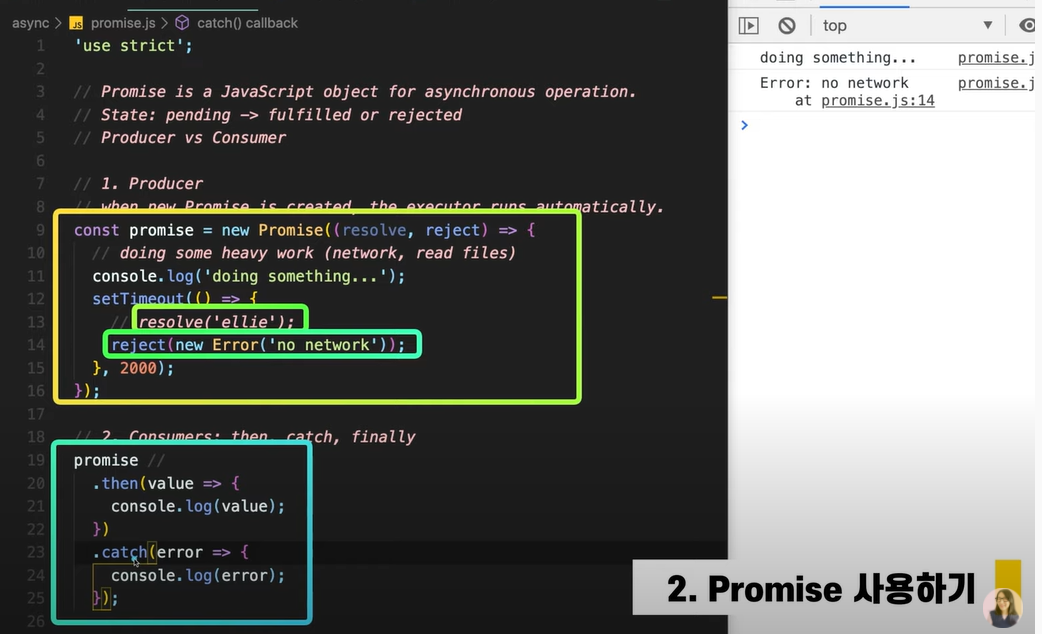 기능 실패로 reject로 에러를 반환하면, catch()로 에러를 핸들링 할 수 있다.