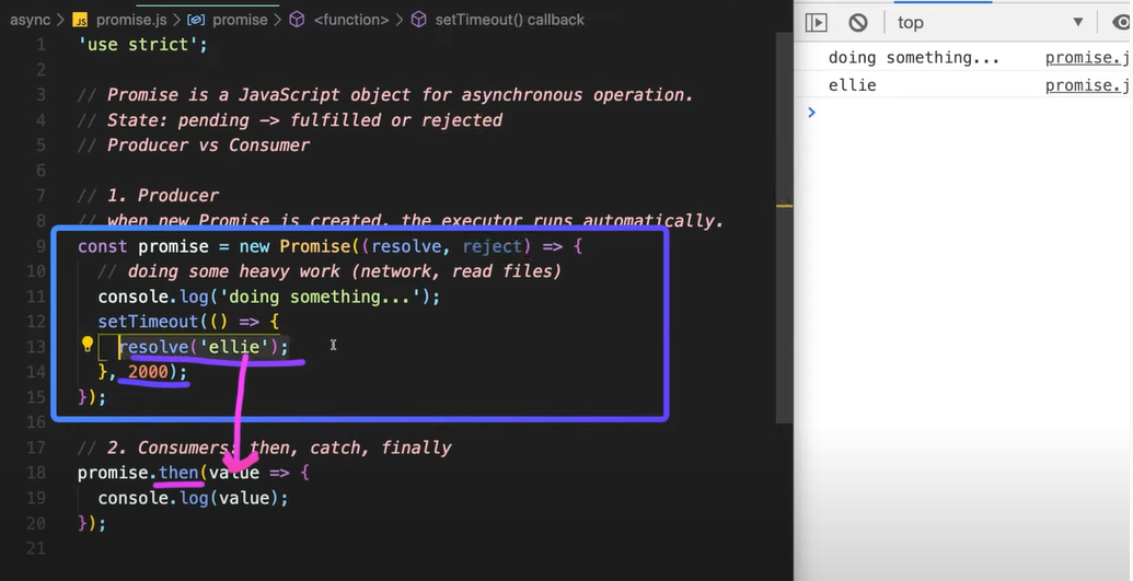 resolve : Promise가 성공적인 값을 반환함을 의미