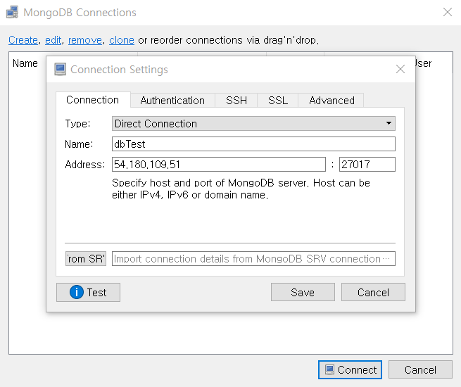 - Robo3T를 이용해 AWS 서버의 DB에 접속합니다.