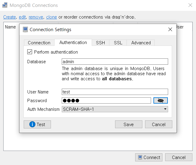 db.createUser({user: "test", pwd: "test", roles:["root"]});