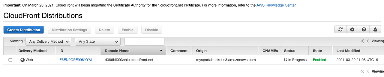 생성 후 배포 리스트에 객체가 생겼음을 확인할 수 있는데 도메인 이름 으로 웹 브라우저에 접속을 할 수 있습니다.