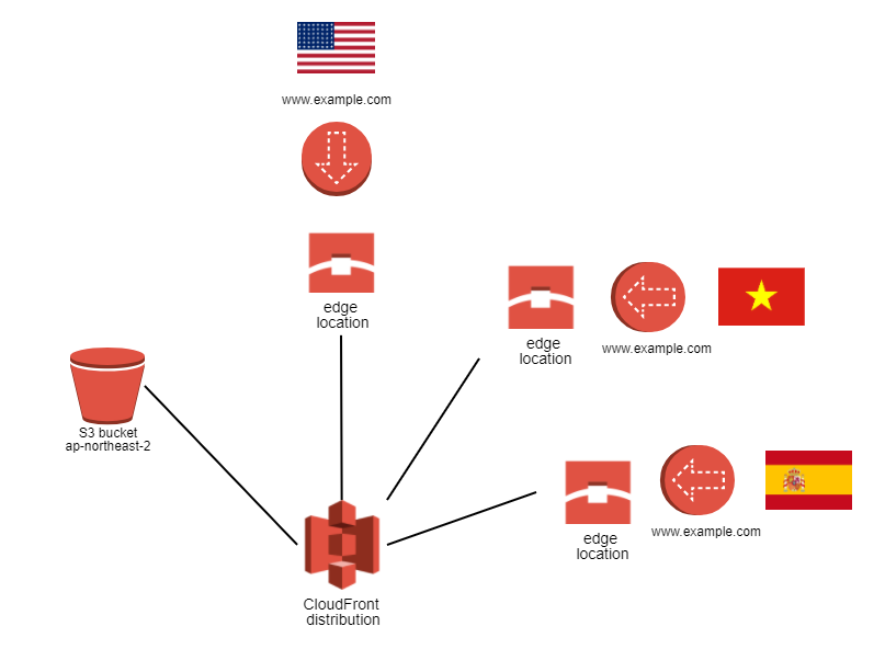 - 하지만 CloudFront를 사용하면 , 세계 각지의 AWS 내의 Edge location에 캐싱 파일이 생성되어 가장 가까운 edgelocation으로 접속을 할 수 있어서 빠른 접속을 가능하게 합니다.