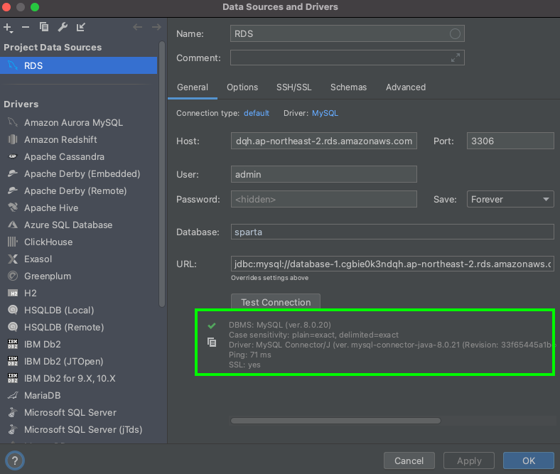- User , Password : RDS 생성 시 만들어준 마스터 아이디(admin)