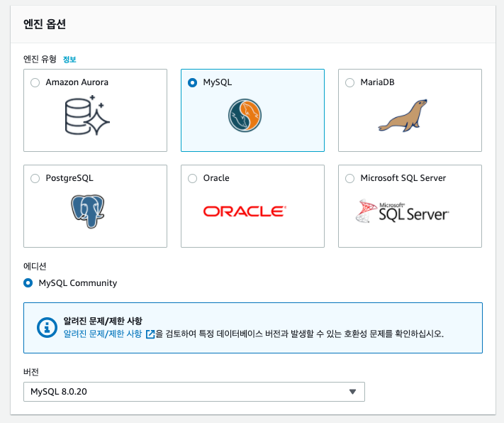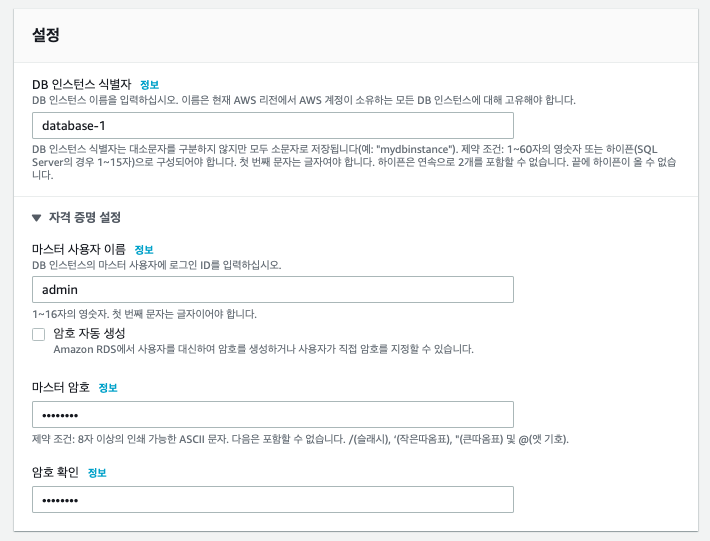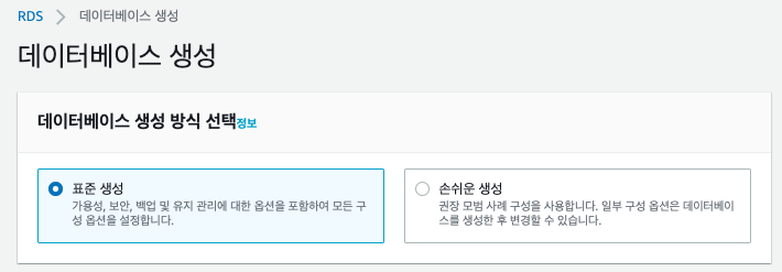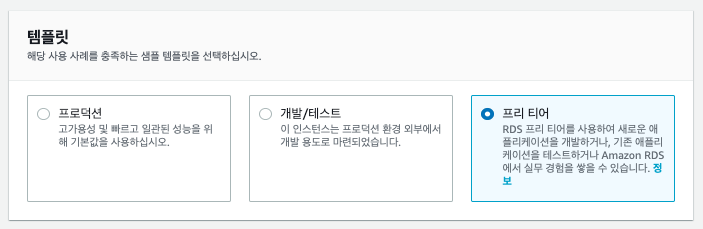 - 프로덕션은 RDS 에서 제공하는 기본적인 설정값을 사용하도록 하는 옵션입니다. 데이터베이스 제품들에 따라 설정하는 옵션값들이 많이 있습니다. 최적화된 옵션을 실제 운영하는 환경이라는 전재하에 제공합니다.
