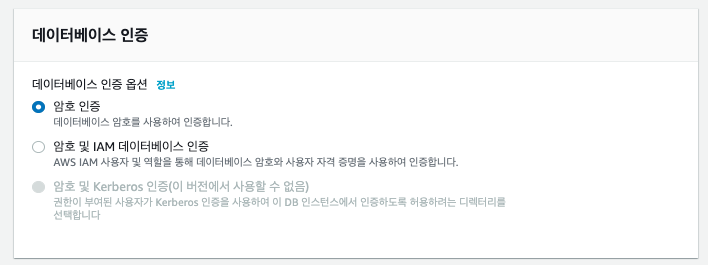 - 데이터베이스 인증 옵션은 데이터베이스에 접속할때 인증방법을 선택합니다.