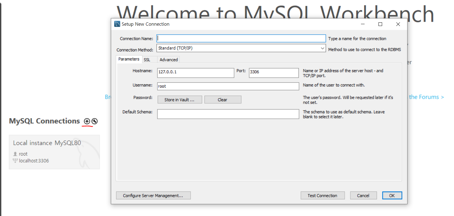 RDS를 파이참에 연결한 것 처럼 mysql 워크벤치에서 새로운 커넥션을 생성하여 host 에 rds 엔드포인트 와 username을 설정해준 마스터 아이디로 설정해 주어 연결을 해주었다.