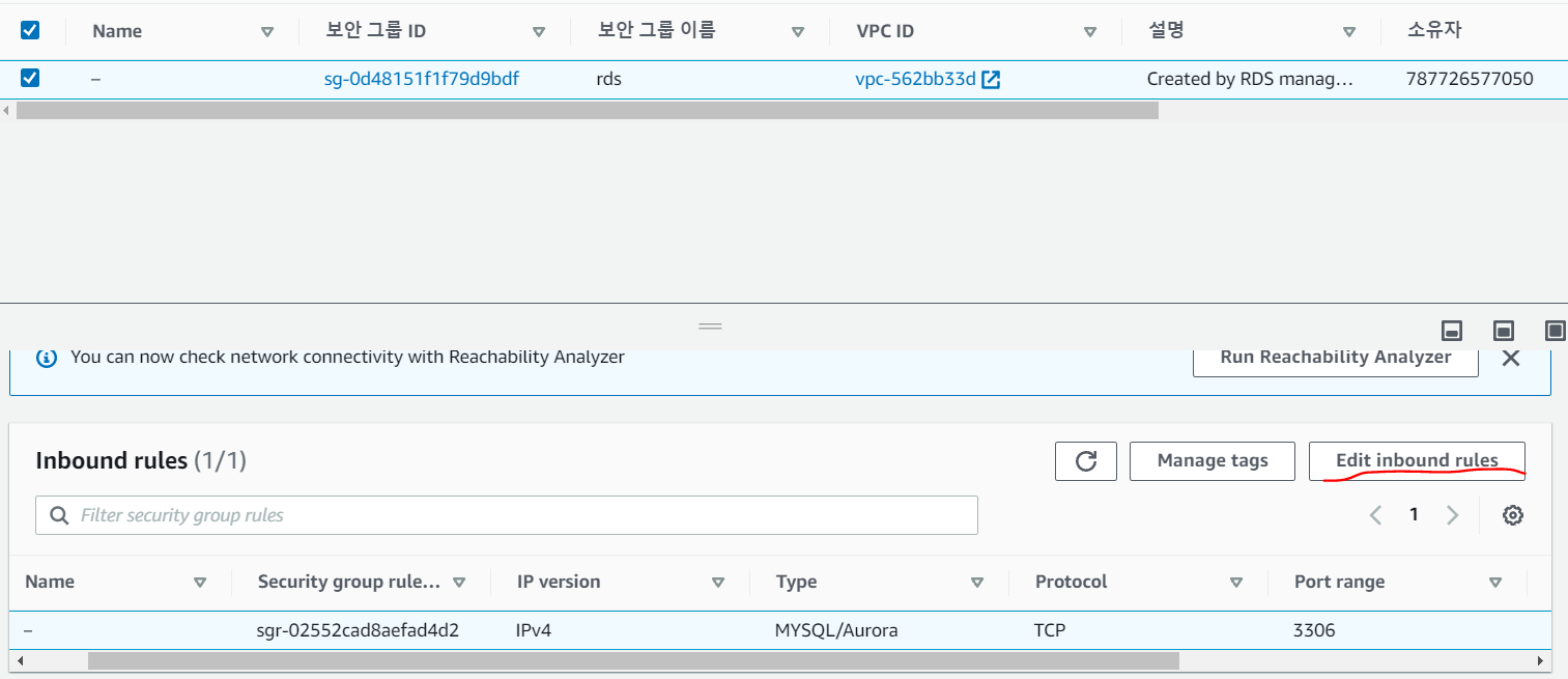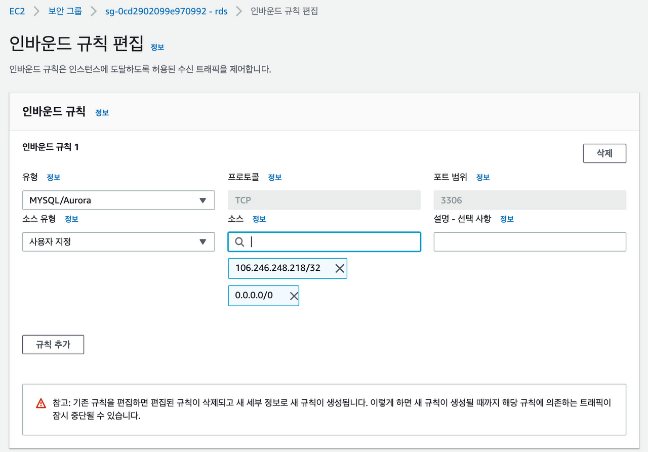 - 생성한 rds 와 로컬 mysql을 연결을 해주었으면 다음으로 AWS RDS로 가서, 보안그룹 인바이드 규칙을 편집해 주어야한다.