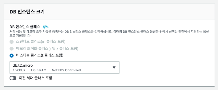 - DB 인스턴스 클래스는 인스턴스의 스팩을 선택하는 부분입니다. RDBMS를 RDS가 관리해 준다고 해도 어딘가에는 서버 컴퓨터가 존재하겠죠 어딘가에 존재하는 서버 컴퓨터의 스팩을 선택합니다. 고사양의 스팩을 선택할수록 비용이 많이 나옵니다.