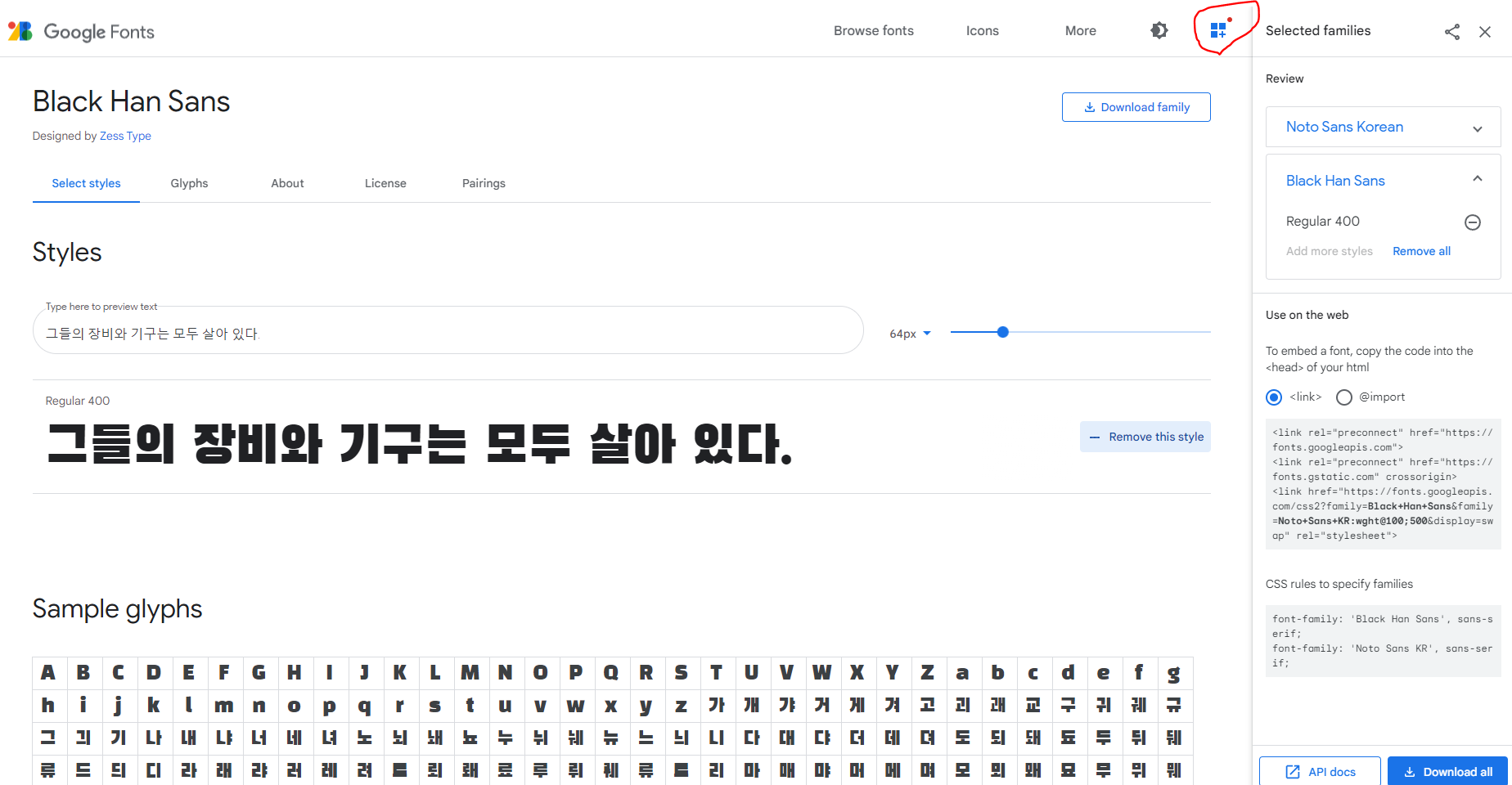 1. 구글 폰트를 검색해 들어간 다음 마음에 드는 폰트를 선택한다