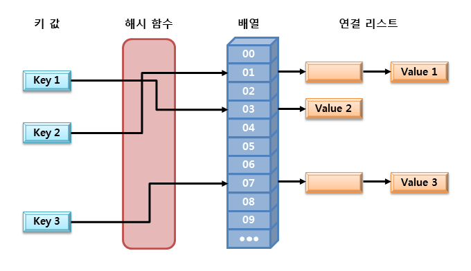 - 자바에서 해시 알고리즘을 이용한 자료 구조는 위의 그림과 같이 배열과 연결 리스트로 구현됩니다.