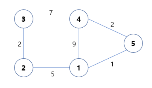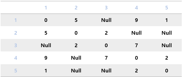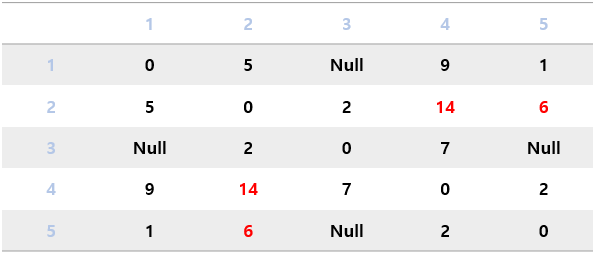 이런 과정으로 5번 노드를 중간 노드로 선정하는 라운드까지 모두 거치면 행렬에는 모든 노드 간 최단 거리가 들어가게 됩니다.