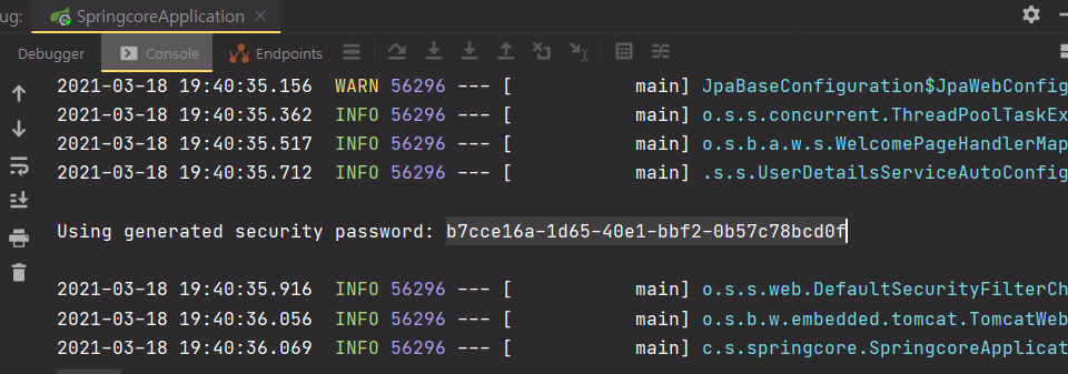 - Password: spring 로그 확인 (서버 시작 시마다 변경됨)