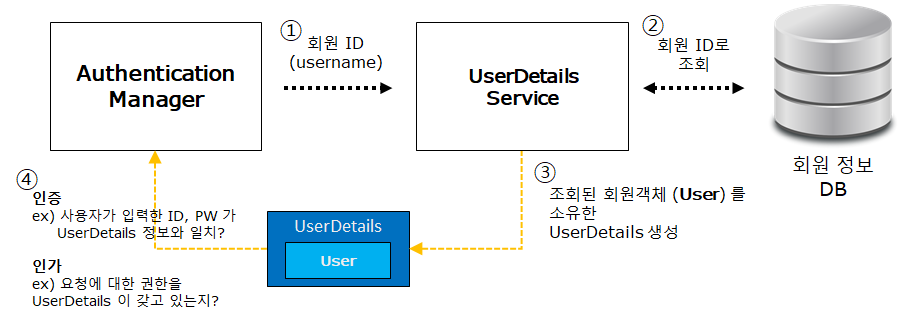회원 정보를 UserDetailsService에서 디비정보를 조회해 호가인한다.