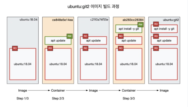 - 이미지가 빌드될 떄 명령어가 레이어에 쌓여가는 과정은 아래 사진과 같이 명령어 별로 Read Only(읽기 전용) 쌓아가는 것 입니다.