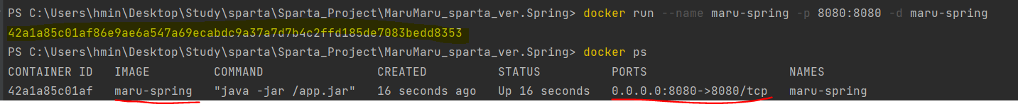 사진의 PORTS를 보면 로컬의 어떤 포트가, 도커의 포트랑 연결되어있는지 볼 수 있습니다.