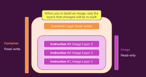 - 이미지의 모든 명령어는 도커에서 관리하는 "읽기 전용" 레이어가 되고, 해당 이미지를 컨테이로 실행시킬 때 "쓰기 가능한" 최종 레이어가 생성됩니다.