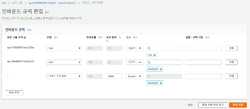 그러면 인자 localhost:8080으로 접속할 수 있는데 → 그 전에 AWS에서 8080포트를 열어주어야합니다.