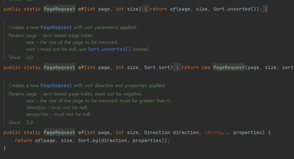 Service를 보면, Pageable 인터페이스의 값을, PageRequest.of()를 이용해서 받아오는 걸 볼 수 있다.