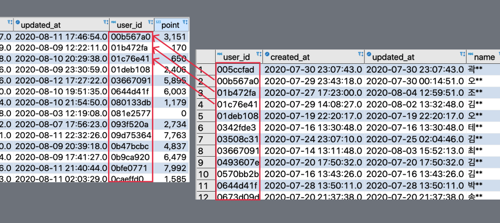 👉 이럴 때를 대비해서 무언가 연결된 정보가 있을 때, user_id 처럼 동일한 이름과 정보가 담긴 필드를 두 테이블에 똑같이 담아놓는데 이런 필드를 두 테이블을 연결시켜주는 열쇠라는 의미로 'key'라고 부른다.