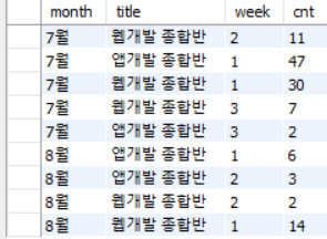 select '7월' as month, c.title, c2.week, count(*) as cnt from checkins c2