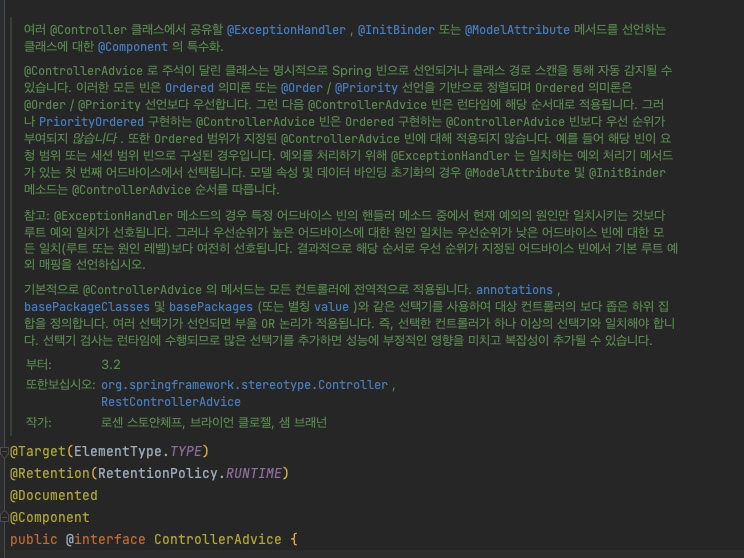 - @ControllerAdvice 어노테이션은 @ExceptionHandler, @ModelAttribute, @InitBinder 가 적용된 메서드들에 AOP를 적용해 Controller 단에 적용하기 위해 고안된 어노테이션이라고 합니다.