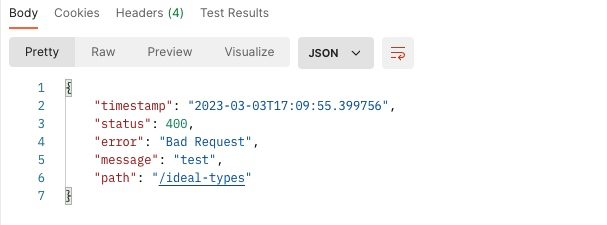 그럼이제 이렇게 보였던 에러 메세지가 → 오른쪽처럼 커스텀하고 더 명확하게 핸들링해서 요청자에게 응답메세지를 보내줍니다.