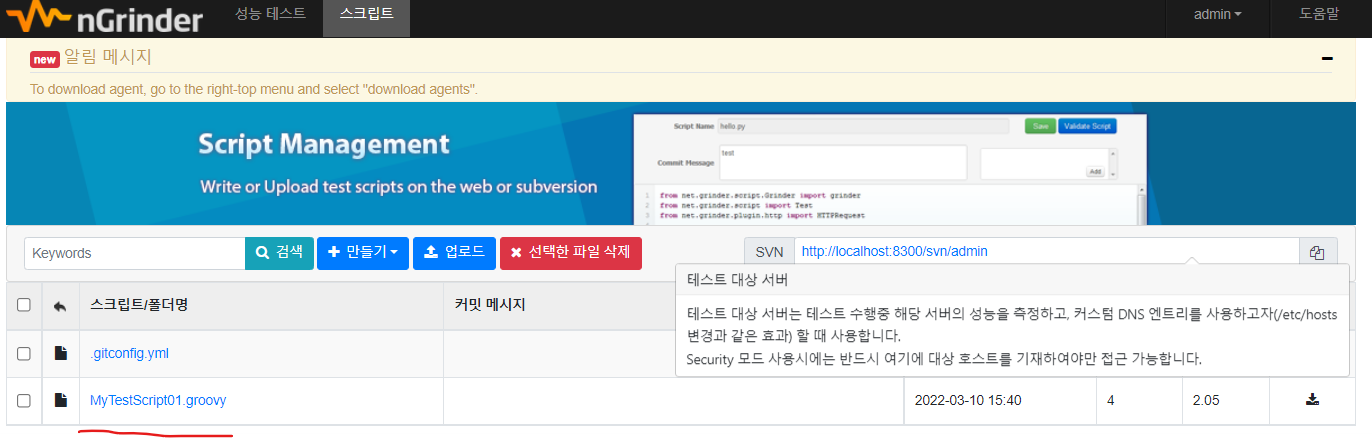 - nGrinder Admin Web > admin > Download Agent 클릭하여 에이전트 파일을 다운로드합니다.
