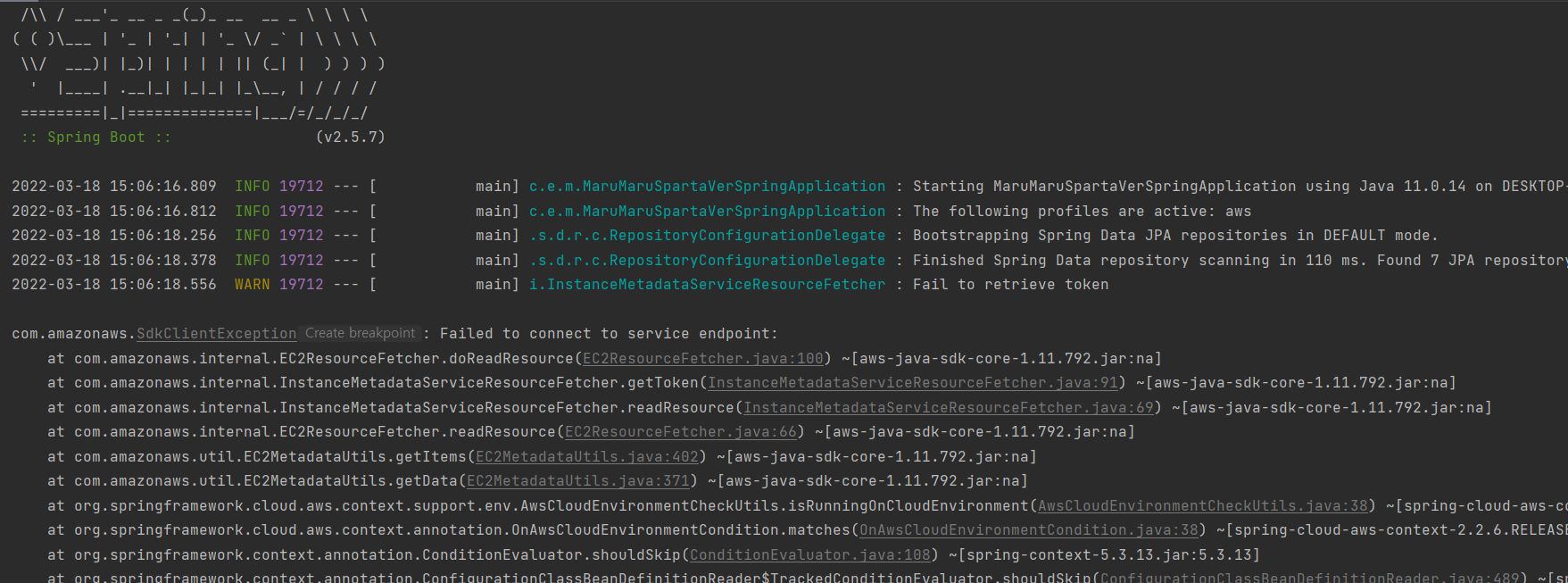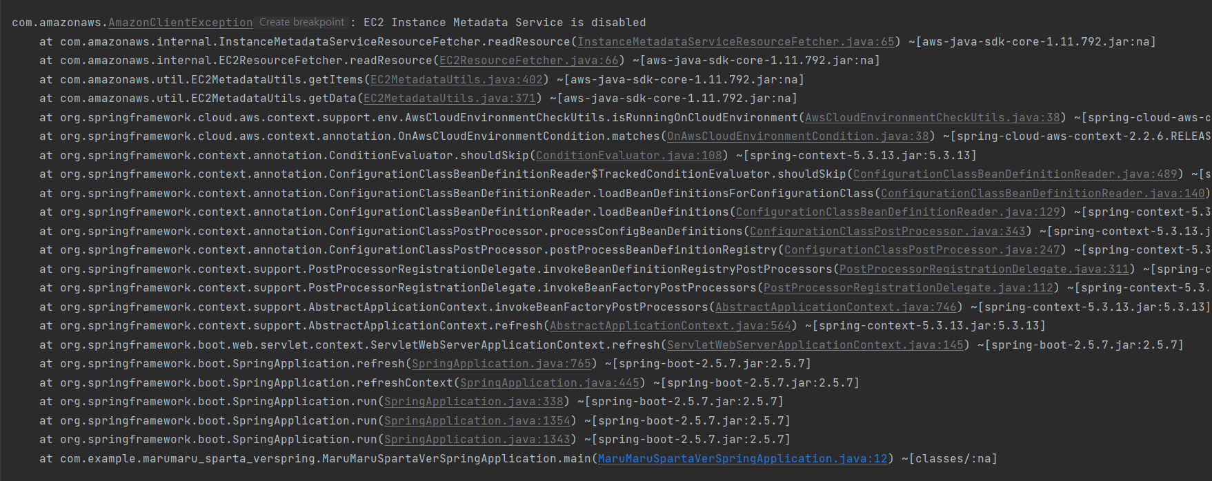 해당 에러는 EC2 메타데이터를 제외하고 실행한다는 의미로, 어플리케이션 실행 시 딜레이가 없어졌다는 의미입니다!