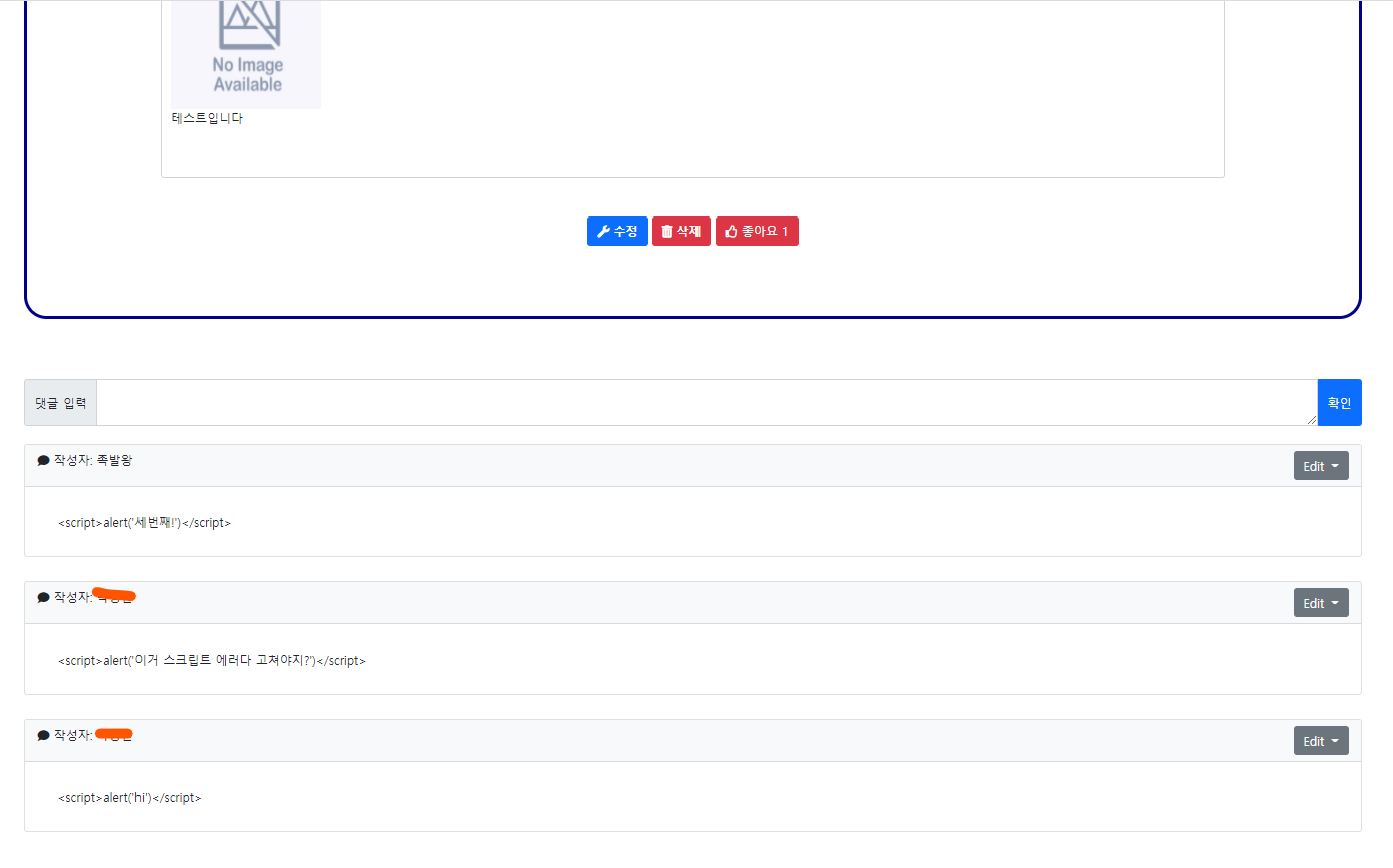 프로젝트 댓글에, 누군가 XSS 공격을 해놓았다.. 껄껄껄
