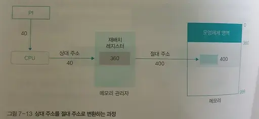 3) 메모리 관리자는 재배치 레지스터를 사용해 상대주소 40번지를 절대주소 400번지로 변환