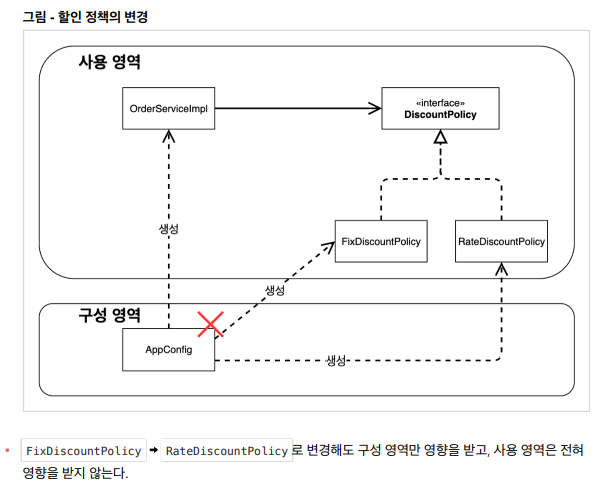 - 반면, AppConfig가 등장한 이후에는 구현 객체는 자신의 로직을 "실행하기만" 하고 프로그램의 제어 흐름은 "AppConfig"가 가져간다.
