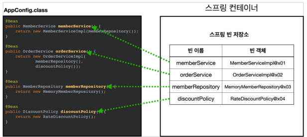 - new AnnotationConfigApplicationContext(AppConfig.class) 를하면, 스프링 컨테이너 생성되어, 빈을 저장할 저장소를 만든다.