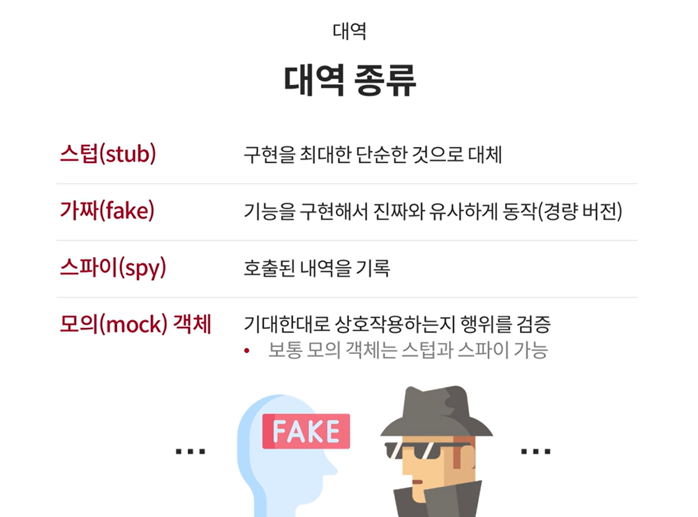 - 의존 대상의 구현을 대체할 대역을 만들어서 테스트 작성