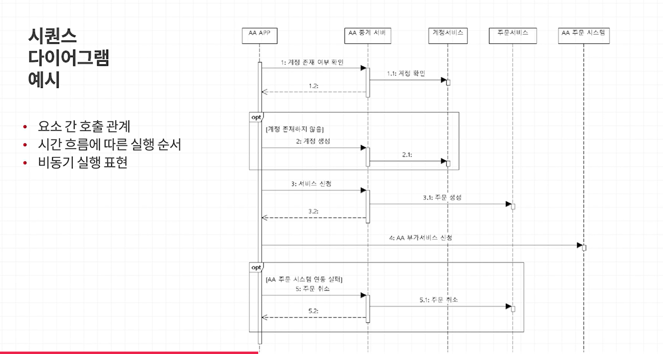 - 시퀀스 다이어그램 : 구성 요소간 연동 흐름