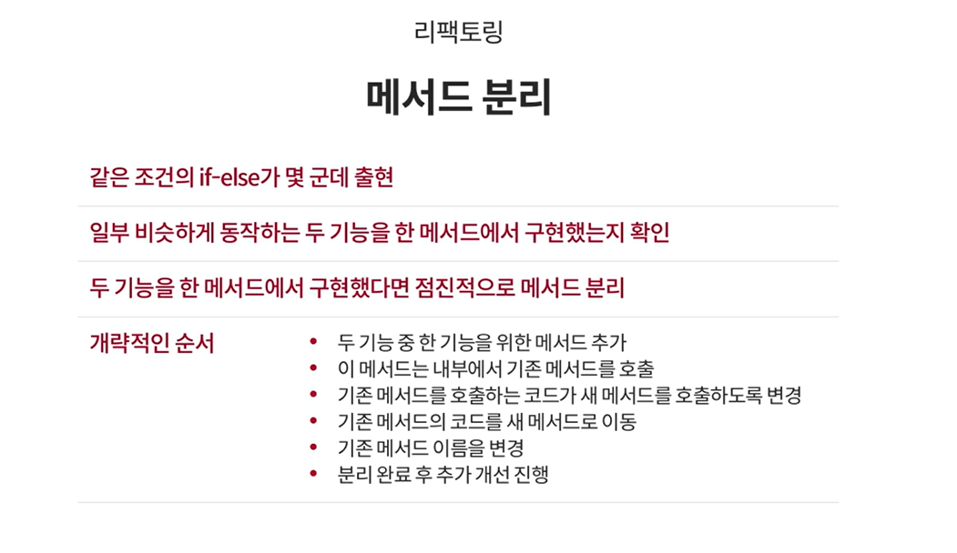 - 두 기능을 한 메소드에서 구현했다면, 점진적을 ㅗ메소드 분리