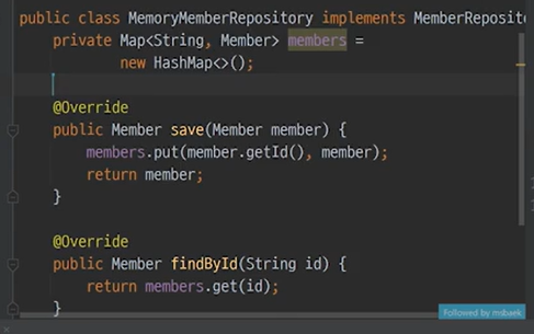 - RepositoryImpl 을 테스트를 위해 Map<> 으로 구현