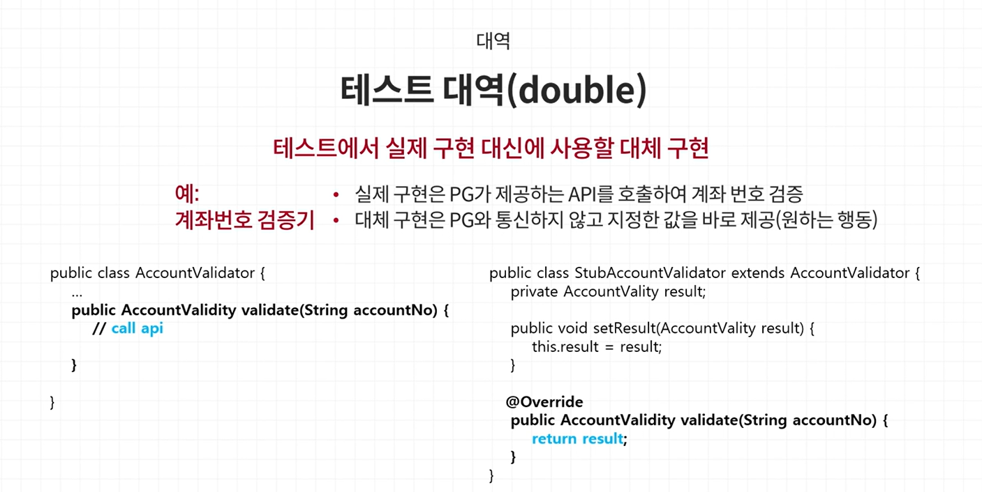 - 테스트 대상 : 대역을 사용할 수 있는 구조로 변경 필요