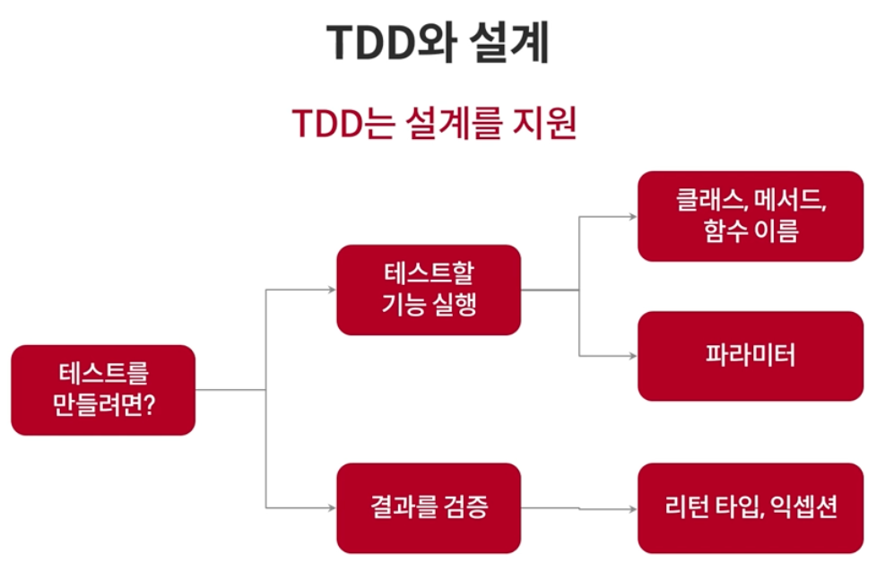 TDD를 하게되면, 자연스럽게 코드의 기대값과 결과값을 생각하게 되므로, 설걔의 관점에서 코드를 작성하게 된다는 장점이 있습니다.
