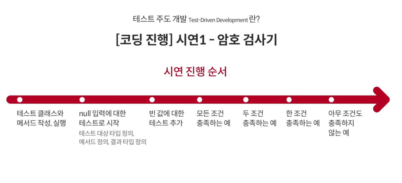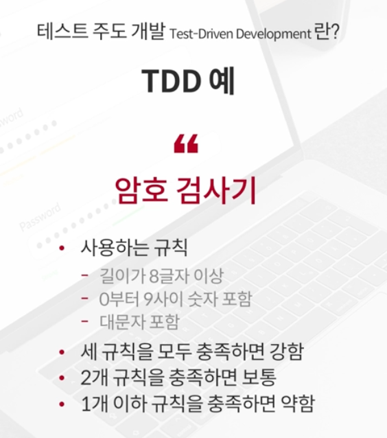 - 그 과정에서 코드가 변경될 때 마다, 테스트를 진행해보는 것이 TDD의 과정이다.