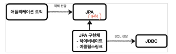 JPA는 자바 진영의 ORM 표준 인터페이스이고, 이것을 구현한 것으로 하이버네이트와 이클립스 링크 등의 구현 기술이 있다.