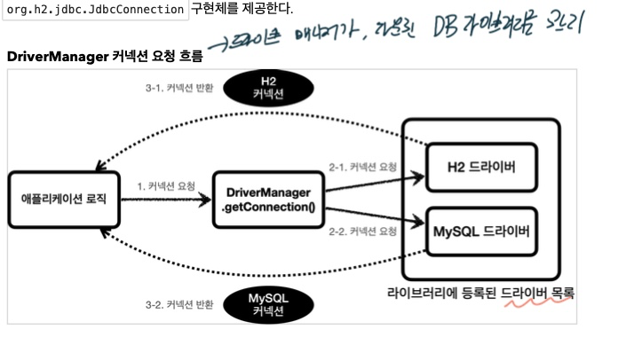 - 그래서 DriverManager.getConnection() 은 데이터베이스 드라이브러를 찾아 해당 드라이버가 제공하는 커넥션을 반환해주는 것 입니다.