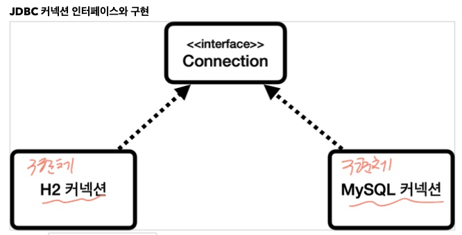 - 데이터베이스 연결 로직을 jdbc 인터페이스에 의존하게 됨으로써, 다른 데이터베이스 종료로 변경하여도, jdbc 구현 라이브러리만 변경해주면 됩니다.