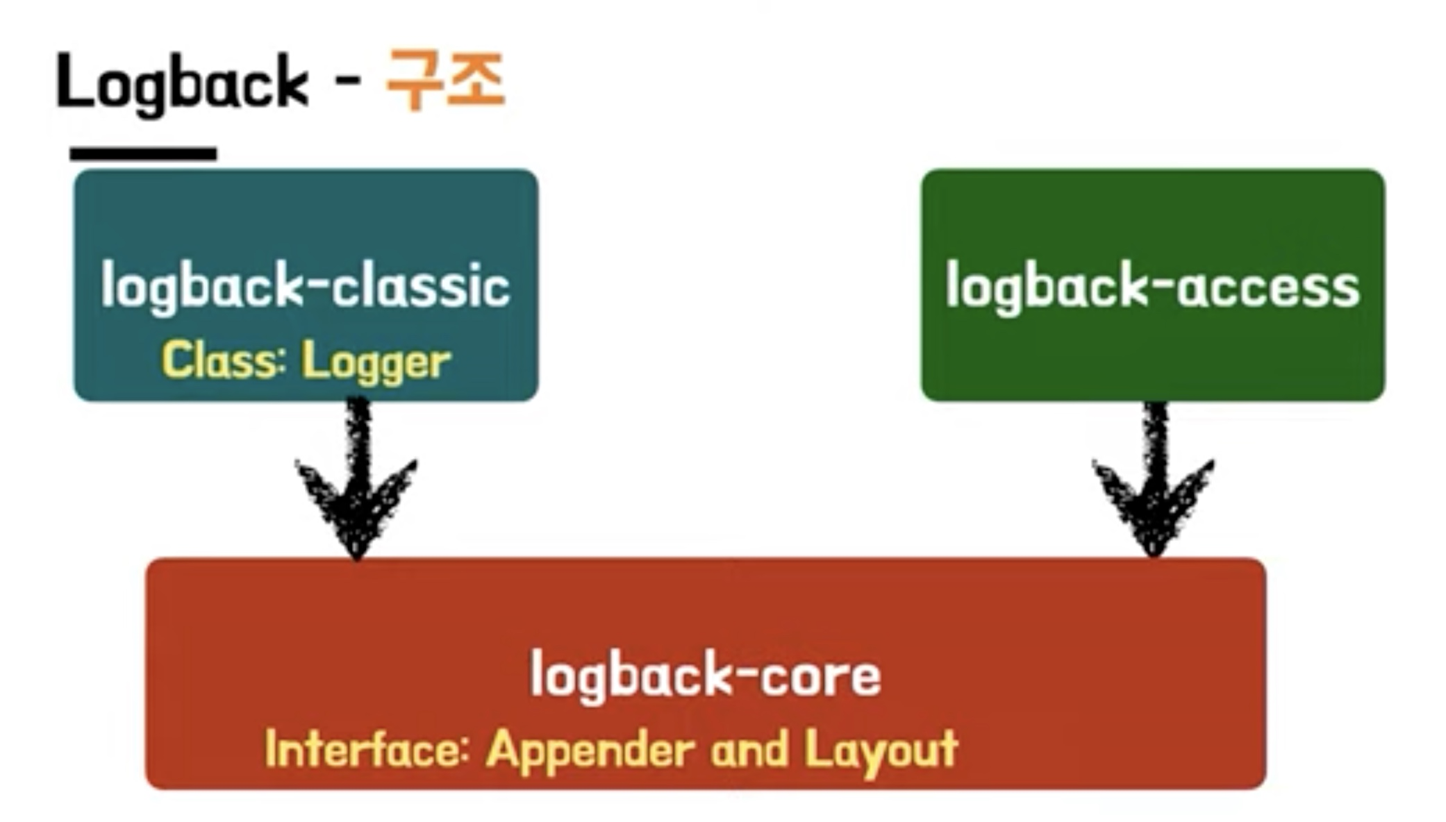 - logback-core를 가지며 slf4j API 를 구현하여, log4j 또는 java.util.logging(JUL)과 같은 다른 로깅 프레임워크 간에 쉽게 전환 가능하다록하며