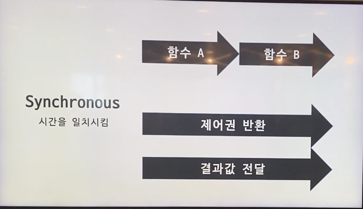 - 호출된 함수의 수행 결과 및 종료를 호출한 함수가(호출된 함수뿐 아니라 호출한 함수도 함께) 신경 쓰면 Synchronous
