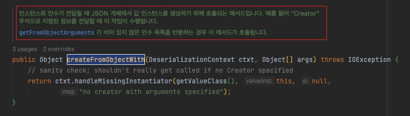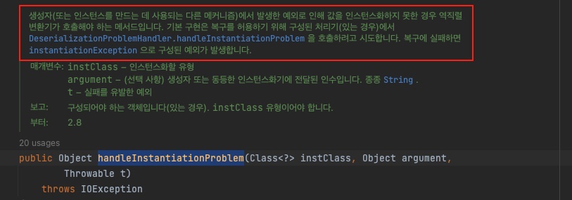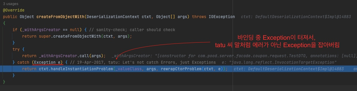 3. 이 때 StdValueInstantiator 클래스에서 재구현 메소드에서 바인딩 시에 Exception 이 터지면 Catch 잡아서 별도의 핸들링 클래스인 handlerInstantiationProblem 메소드를 반환합니다.