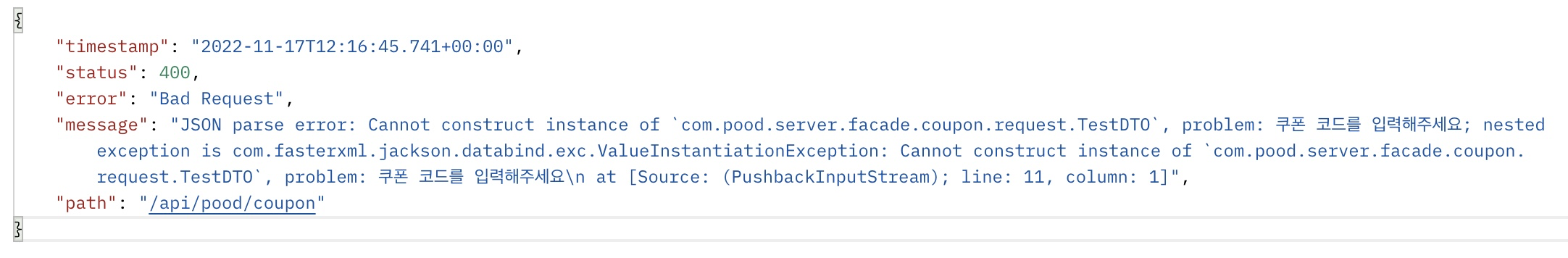 "message": "JSON parse error: Cannot construct instance of `com.pood.server.facade.coupon.request.TestDTO`, problem: 쿠폰 코드를 입력해주세요; nested exception is com.fasterxml.jackson.databind.exc.ValueInstantiationException: Cannot construct instance of `com.pood.server.facade.coupon.request.TestDTO`, problem: 쿠폰 코드를 입력해주세요\n at [Source: (PushbackInputStream); line: 11, column: 1]",
