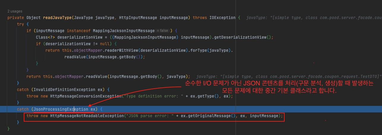 4. 디버깅을 쭉쭉쭉 타게되면 위에서 말했던 AbstractJackson2HttpMessageConverter 의 readJavaType() 메소드를 호출하게 되는데 여기서 JsonException 을 잡아버려서 최종적으로는 HttpMessageNotReableException을 떨궈버립니다.