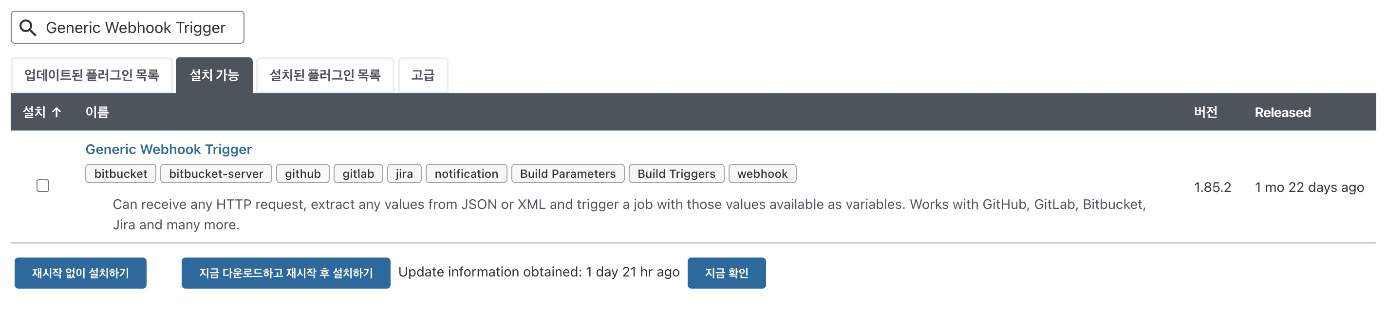 - [Jenkins] - [Jenkins 관리] - [플러그인 관리] - [설치가능] - 검색 : Generic Webhook Trigger