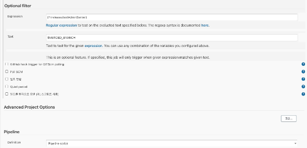 (1) Optional filter 탭을 사용하여서, 들어오는 조건을 정규표현식으로 조건을 걸어, true 일 때만 pipeline 이 빌드되게 설정할 수 있습니다.