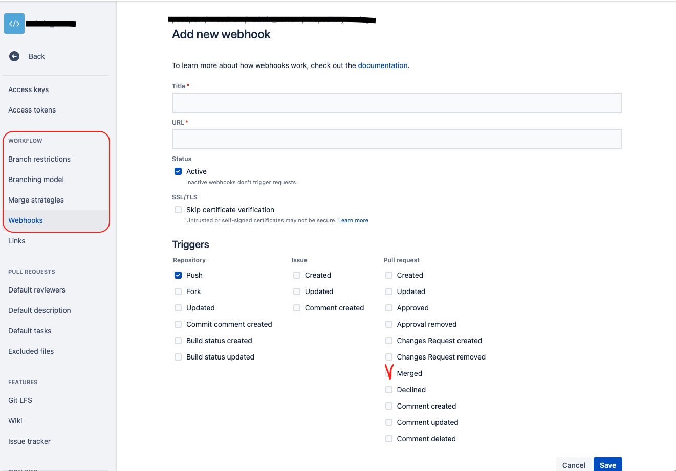 - bitbucket 에 webhook 을 등록하여 merge 를 triger 로 등록합니다.